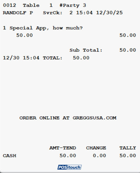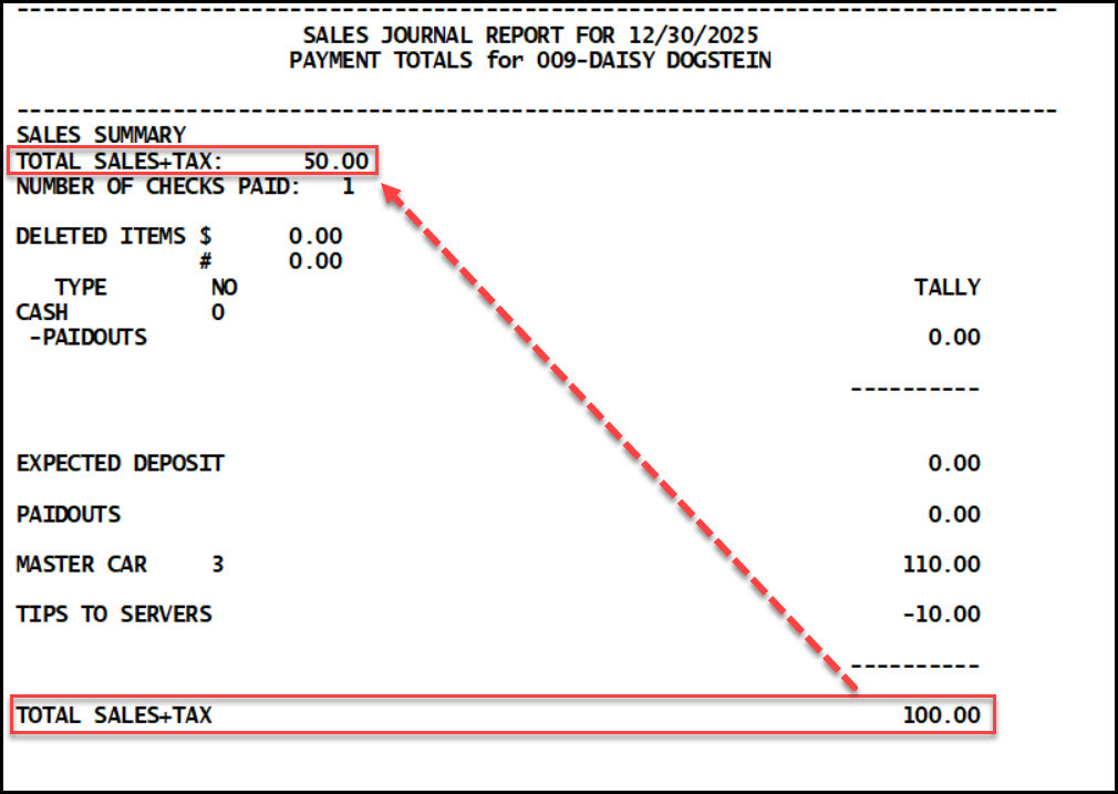 For example, server Daisy has 50% of the team shares. She prints her cashout after taking payment for a check with a total of $100.00 in sales plus tax. Although the full check total is $100.00, Daisy’s individual Sales + Tax amount shows $50.00 because the remaining portion will be shared with other team members.