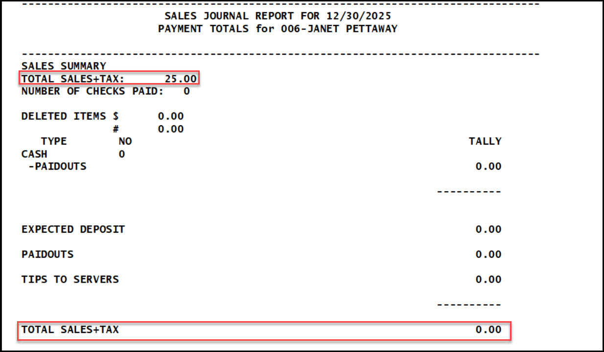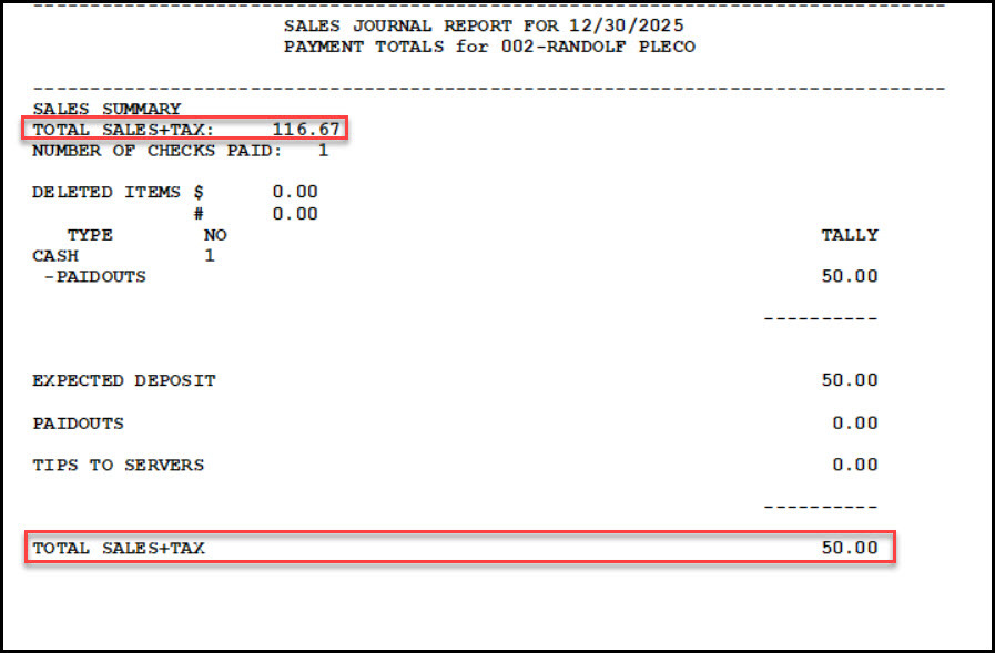 - A cashout of Randolf shows total sales + tax of$116.67 in the sales summary, since he has sales from his team check ($66.67)and his individual check ($50.00). His total sales + tax in the payment section is $50.00, which is the non-team check that he closed.