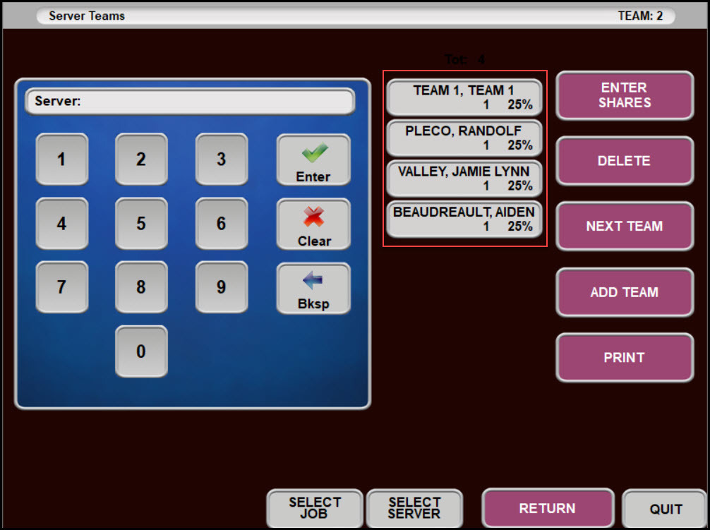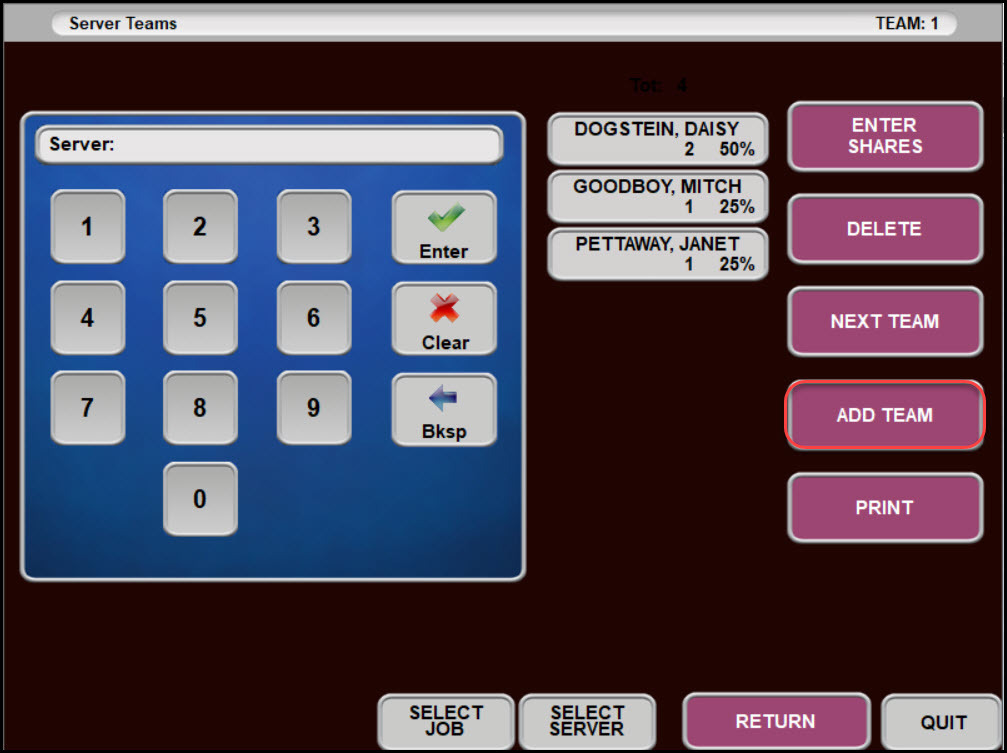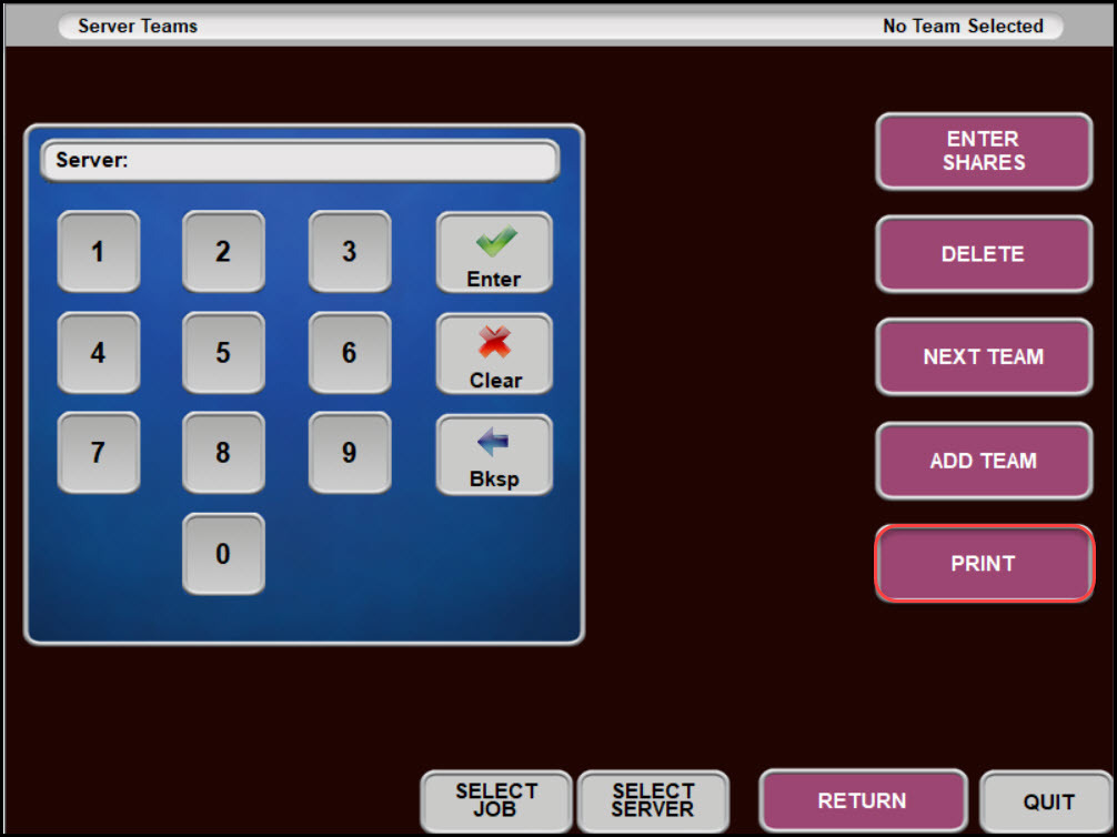 - From the Manager Screen, go to Server Teams and select PRINT to print a list of all teams and their associated shares/percentages.