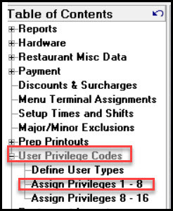 - Select User Privilege Codes > Assign Privileges 1-8.