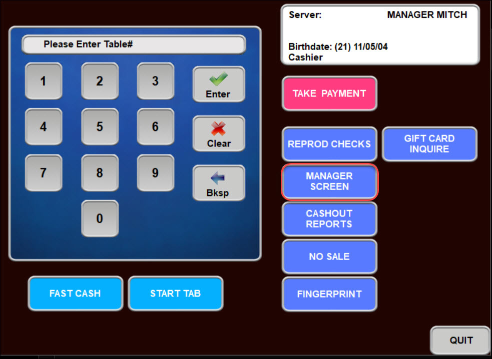 - From the front of the house terminal, swipe the manager's card to proceed. Alternatively, a fingerprint scan or the manager’s number and password may be used.Then, select Manager Screen.