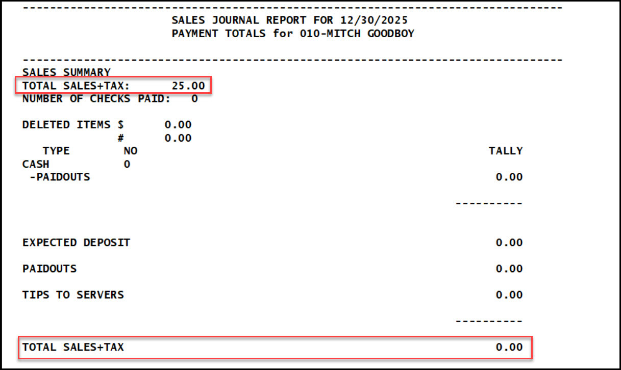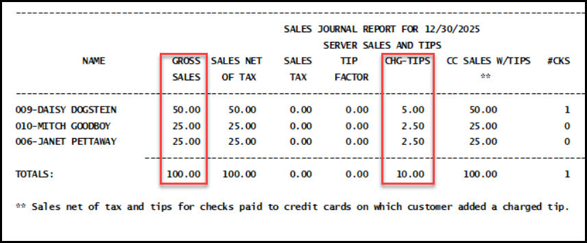 Note: The bottom Total sales + tax figure is showing $0.00 because neither server shown below took payment for the $100.00 check.