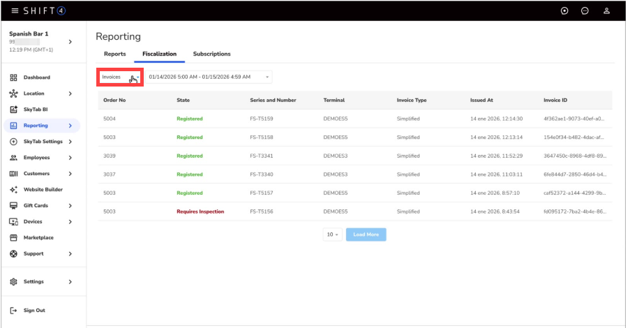 Description: Learn how managers can view, review, and export fiscalized transaction data for SkyTab locations operating in Spain using Lighthouse Business Manager (LBM).