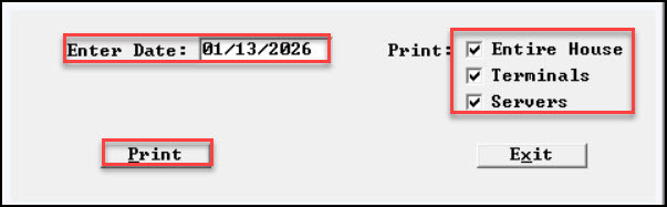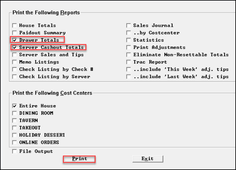 - Select the checkbox for Drawer Totals to get a report by the drawer and Server Cashout Totals to get Cashouts by the server. Then, select Print.