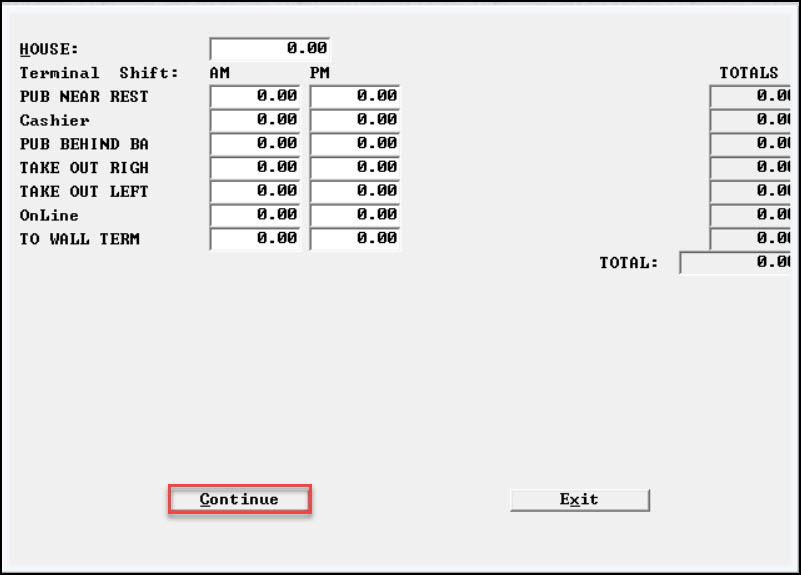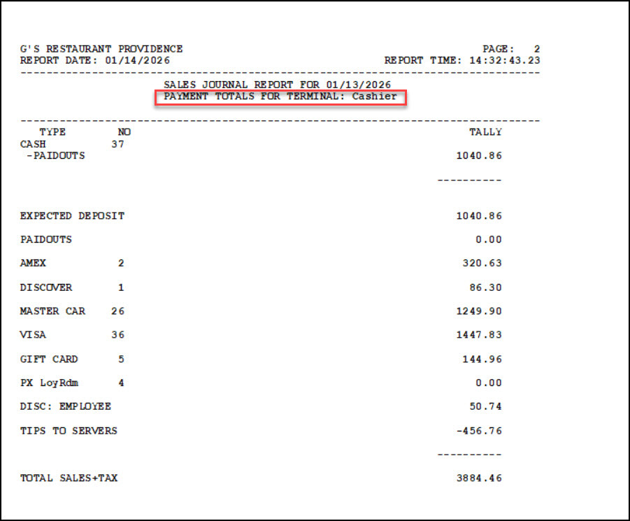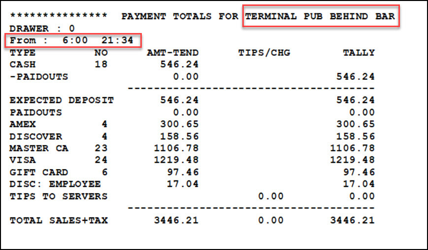 Note: If totals are cleared between shifts, cashouts will be displayed individually by shift. This terminal cashout ran from 6:00 AM until 9:34 PM (21:34 military time).