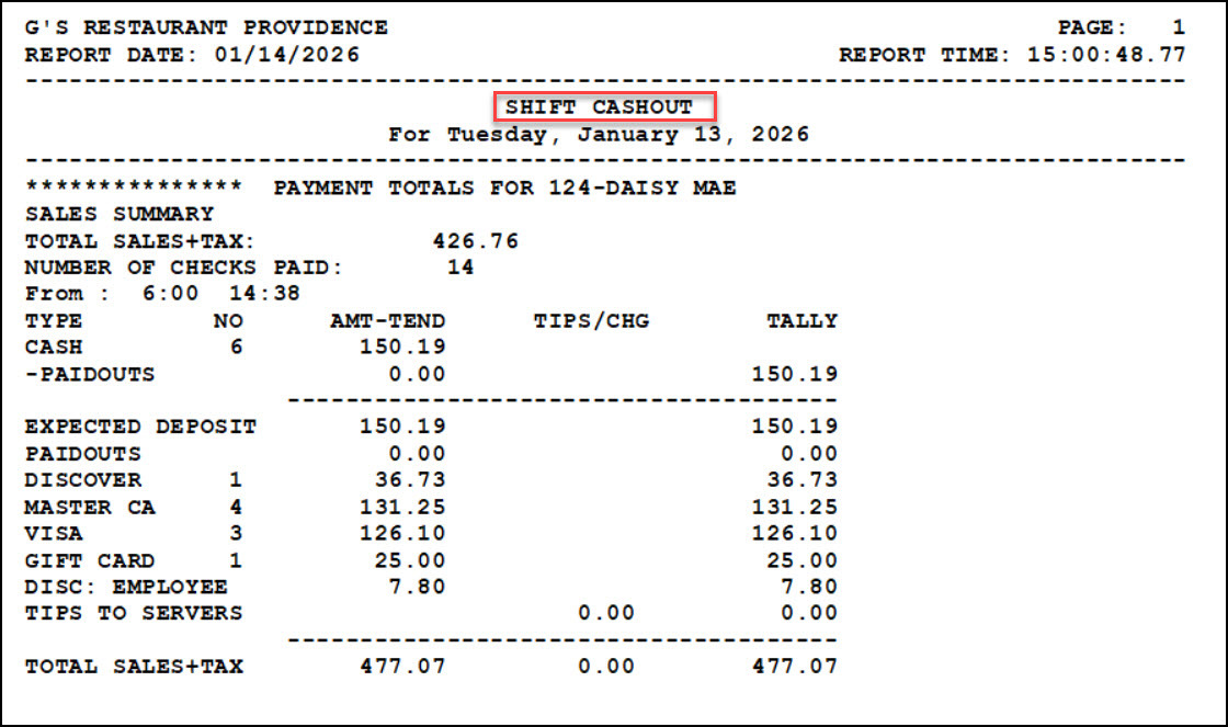 - An example of Shift Cashout by the server.