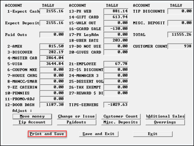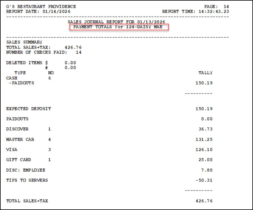 - An example of drawer totals and a server cashout.