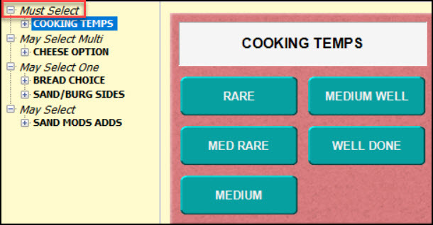 In this example, when a hamburger is ordered, the cooking temp must be selected before continuing. - On the front of the house terminal, the forced choice will prevent further ordering until a cooking temp is selected.