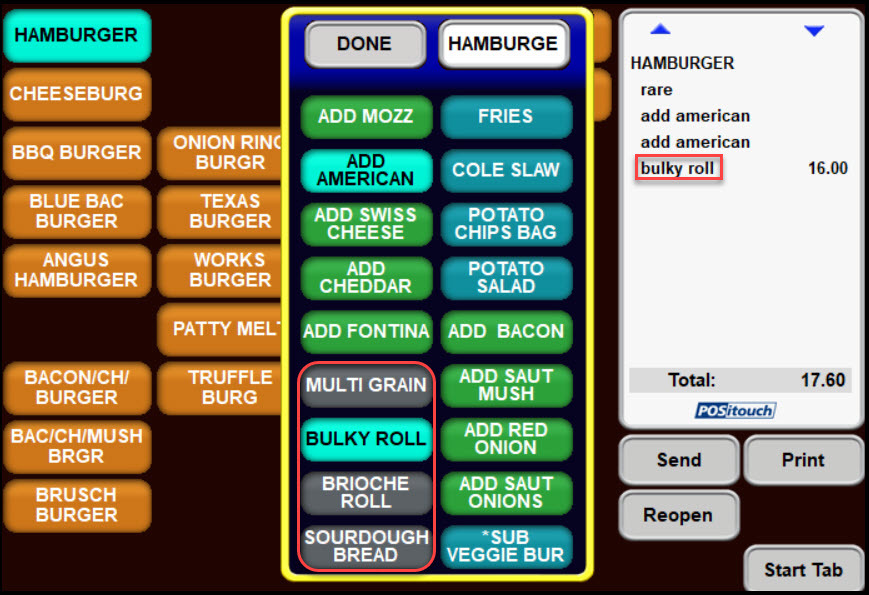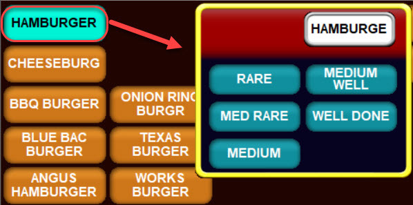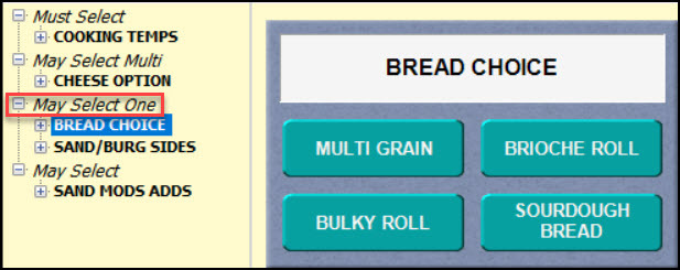 In this example, when a hamburger is ordered and the cooking temp is selected, the optional modifiers will appear. The bread choice option group is set up as a May Select One, which will allow only one of the bread choices to be selected. - On the front of the house terminal, when any option in the bread choice is selected, the other options in that group become grayed out.