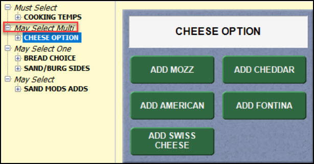 - From the back office in QuickMenu, a modifier group that appears under the category of May Select One will allow for any one of the options in the group to be ordered.