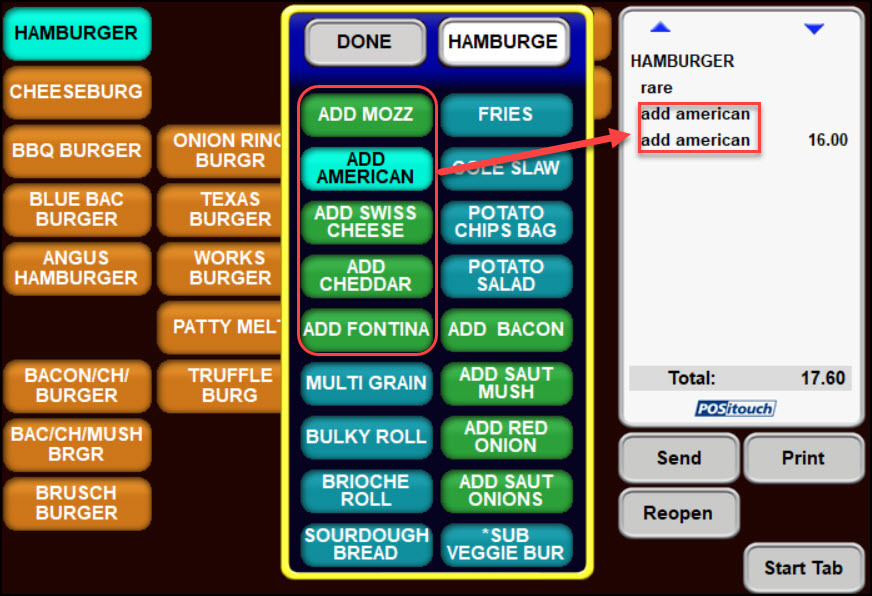 In this example, when a hamburger is ordered and the cooking temp is selected, the optional modifiers will appear. The cheese option group is set up as a May Select Multi, which will allow any or all cheese options to be selected multiple times. - On the front of the house terminal, any of the options in the cheese option group can be ordered multiple times.