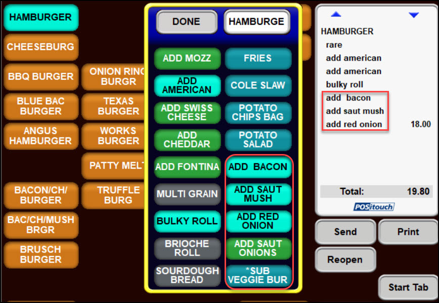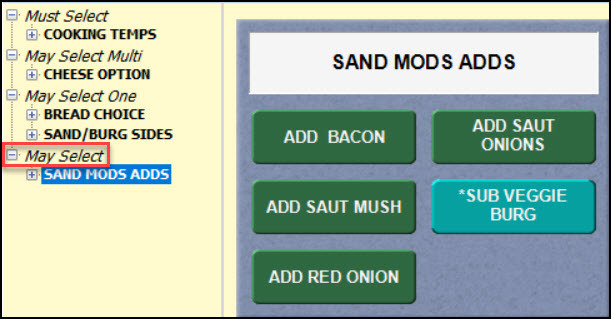 In this example, when a hamburger is ordered and the cooking temp is selected, the optional modifiers will appear. The “Sand Mods Adds” option group is set up as a May Select, which will allow any of the options to be selected but only once. - On the front of the house terminal, any of the options in the “Sand Mods Adds” group can be ordered but only one time each.