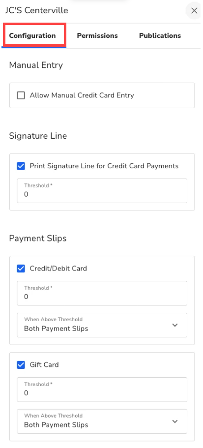 Payment Slips: When enabled, a separate payment slip prints for the following tenders once the threshold amount is met: