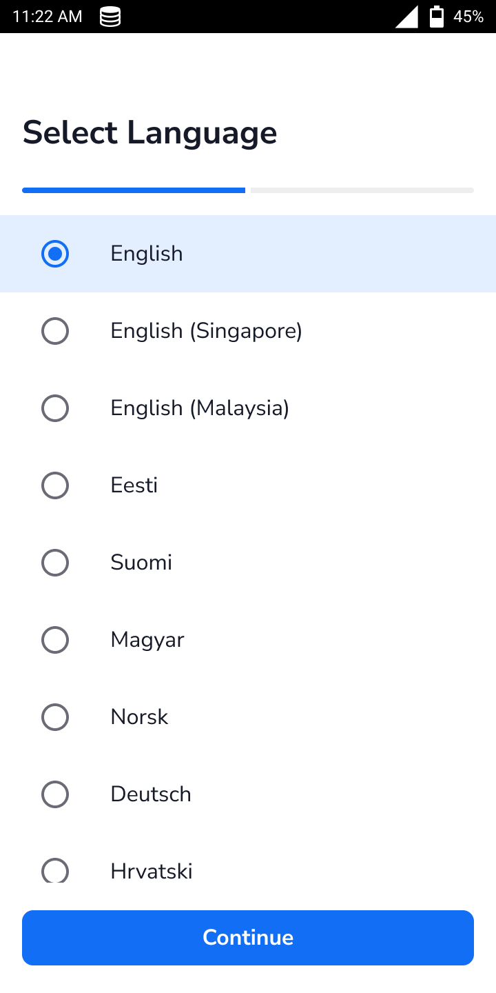 Note: This setting can be changed later if needed. - After selecting a language, select Continue.