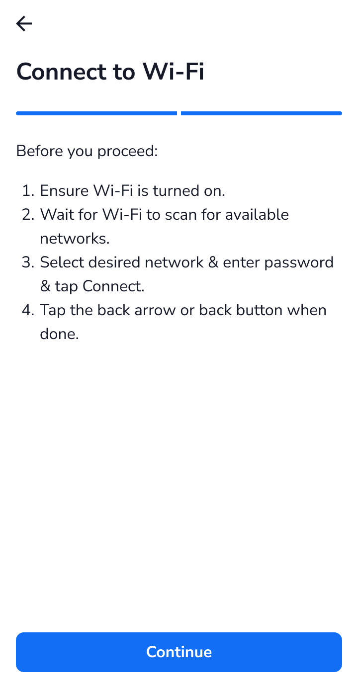 - After selecting the network, the next screen appears automatically. There is no Continue button on this screen.