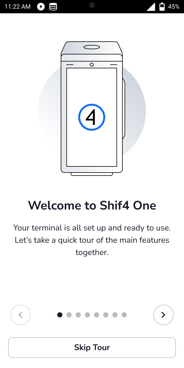 When you download and open the Shift4 One application for the first time, you are guided through a series of required onboarding steps. These steps ensure the device is properly connected, configured, and ready for use.