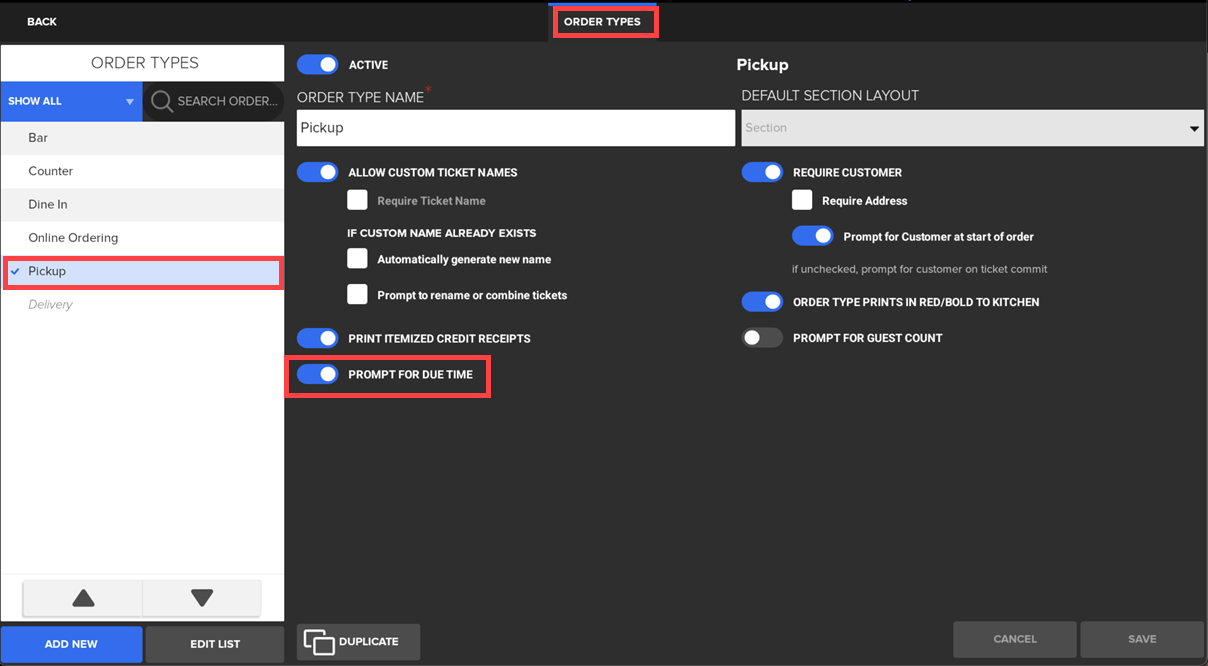 Managers can require staff to set a Due Time before an order is sent to the kitchen or paid for by enabling Prompt for Due Time on specific Order Types.