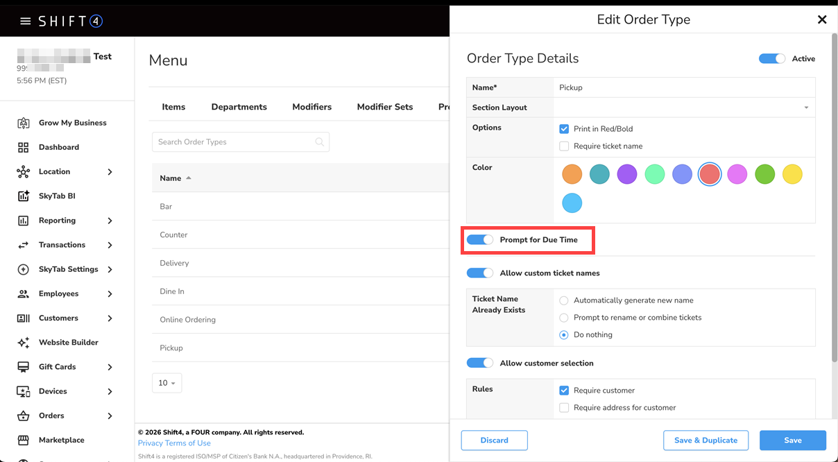 Description: Learn how managers can control Due Time behavior in SkyTab POS, including requiring Due Time for specific Order Types, understanding how Due Time interacts with payments and completed tickets, and managing visibility for time-sensitive orders.
