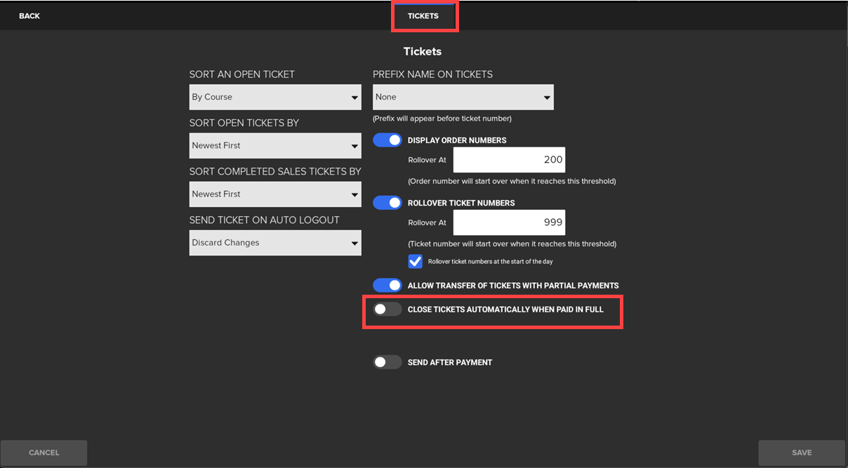 If you want paid tickets to remain visible with their Due Time, it is recommended to disable automatic ticket closure.