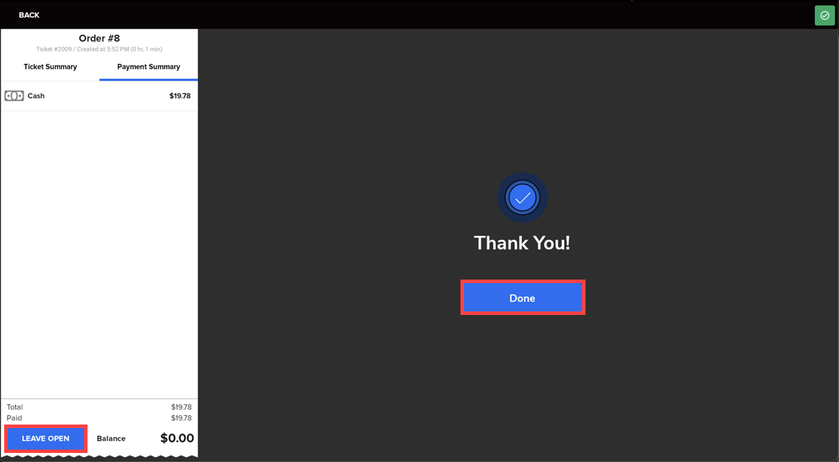 - After taking payment, staff can choose LEAVE OPEN or DONE.