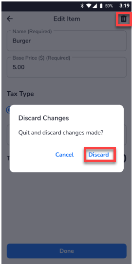 To discard an item before publishing, select the trash icon and confirm Discard.