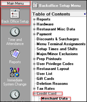 - From the back office Main Menu, navigate to Back Office Setup > Credit Card > Merchant Data.