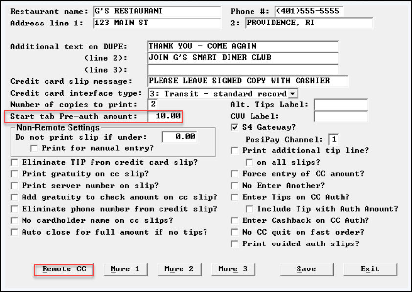 - Enter the amount of the Start tab pre-auth amount and select Remote CC.