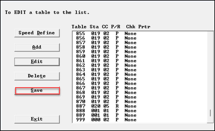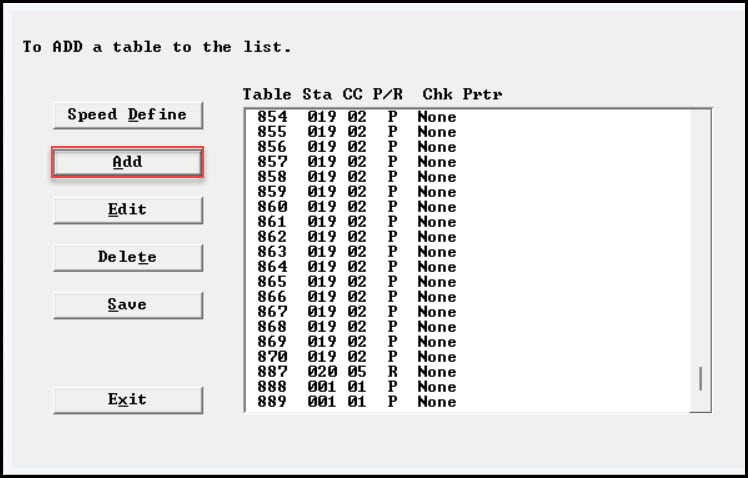 - Scroll to the bottom of the list of tables, and if a table 999 doesn’t exist, select Add.