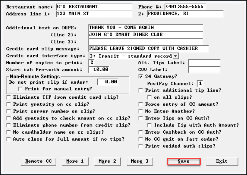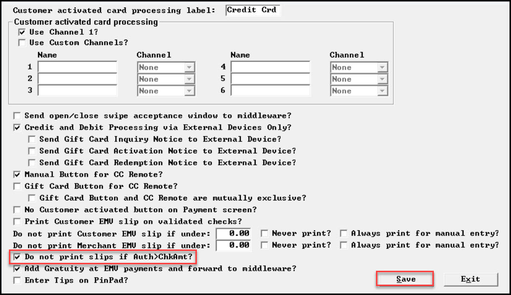 - Enable Do not print slips if Auth>ChkAmt? and select Save. This will prevent a slip from printing when initially applying the pre-auth to a tab.