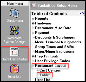 - From the back office main menu, select Back Office Setup > Restaurant Layout > Tables.