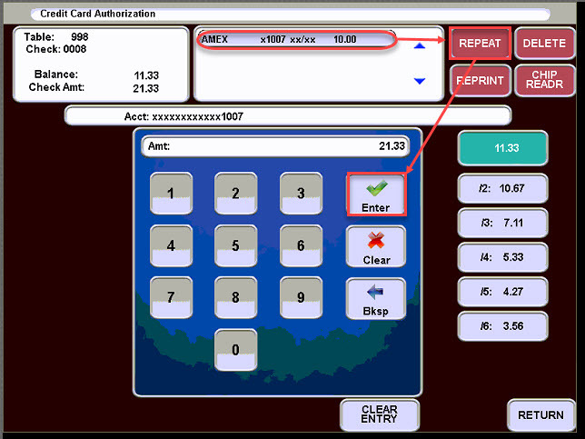 - If the amount of the check is higher than the pre-authorized initial amount, navigate to the payment screen and select CC AUTH > the credit card > REPEAT > ENTER. The new amount will adjust to the amount of the check.