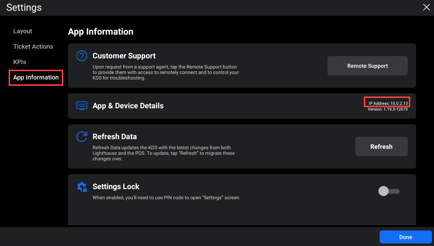 Note: The IP address of the KDS is found by tapping on the gear icon near the bottom left of the KDS screen.