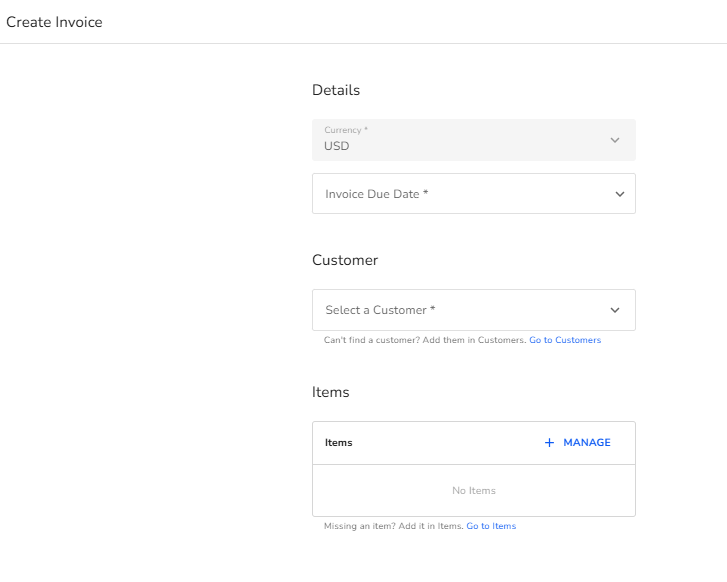 - Customers and items must be created before they can be selected, but you can add them during invoice creation using the provided links.