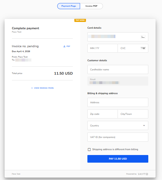 - Review the invoice preview. A preview of the Payment Page and Invoice PDF appears on the right side, allowing you to confirm details before sending.