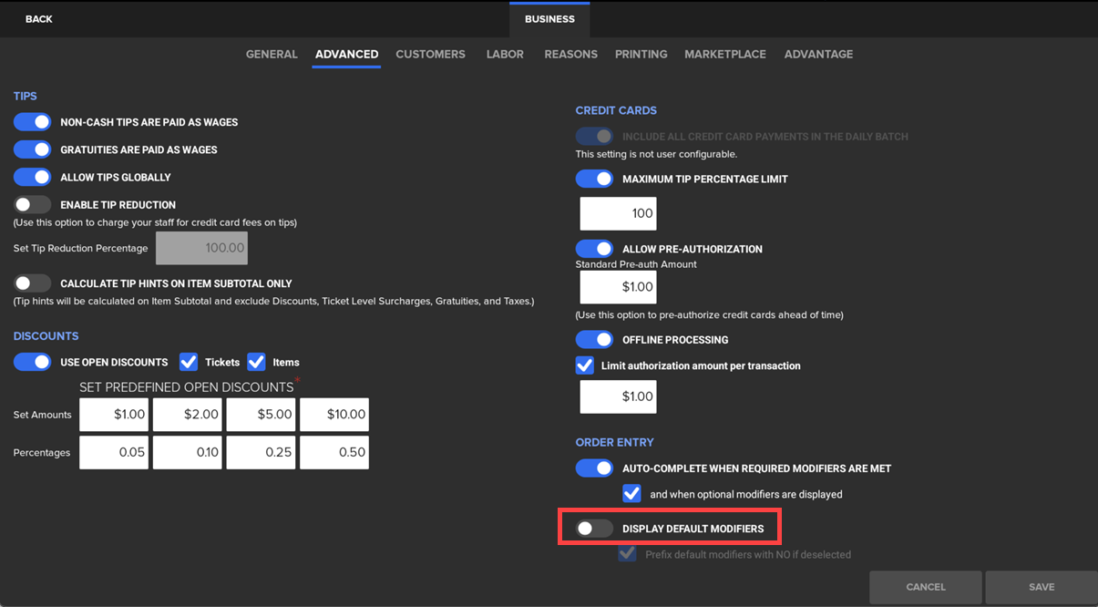 - Display Default Modifiers: Shows or hides default modifiers on POS order screen, kitchen tickets, KDS, and Customer-Facing Displays (CFD).