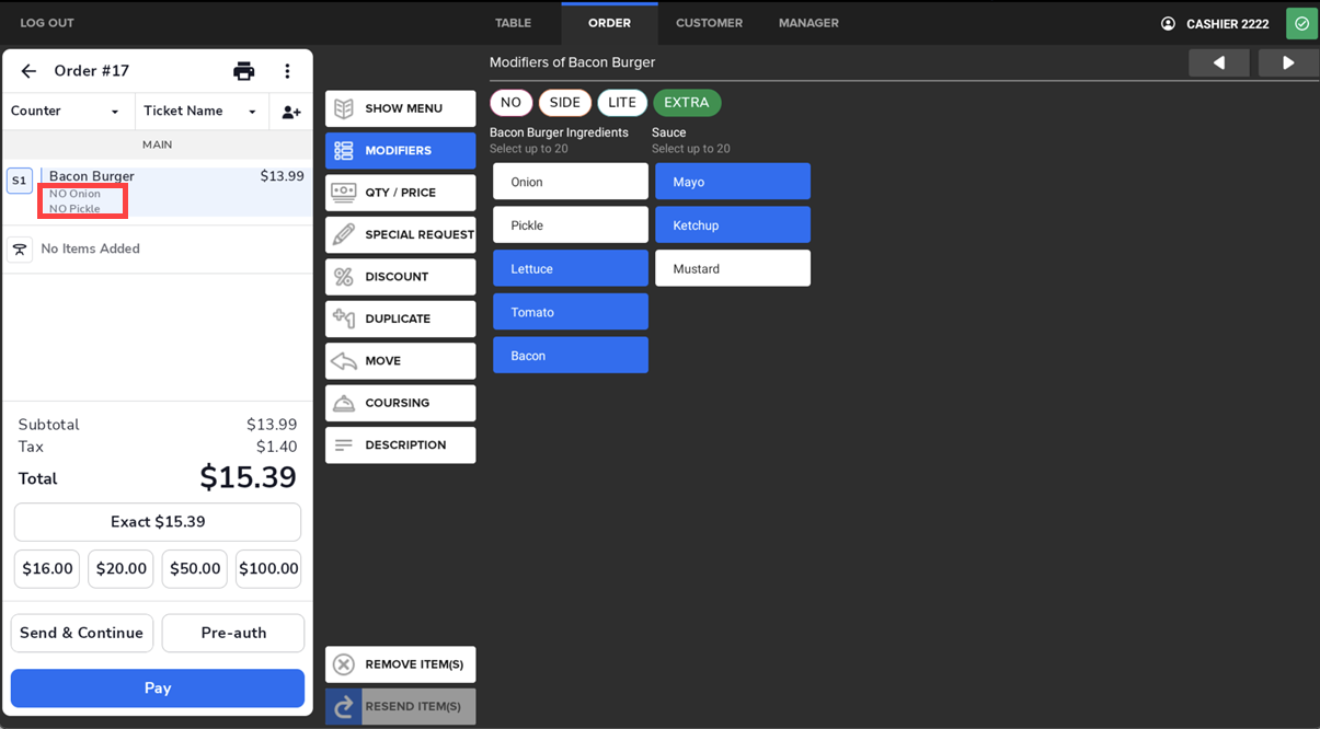 Pre-modifiers such as EXTRA or SIDE can be applied to default modifiers by selecting the pre-modifier first, then tapping the modifier. This works whether the default modifier is already selected or not.