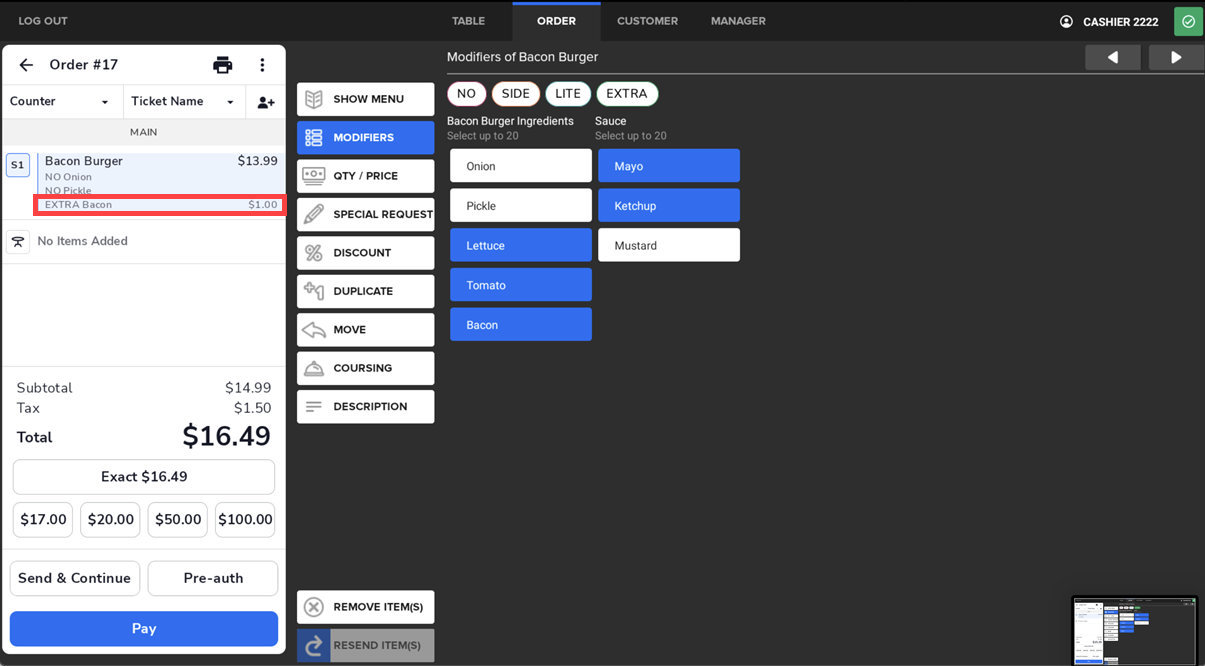 Example: Applying EXTRA to Bacon will display as EXTRA Bacon.