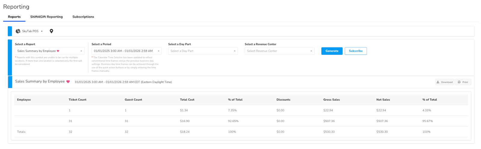 This report shows each employee’s activity over a selected period, including ticket count, guests served, costs, discounts, and sales totals. It helps compare individual performance and contribution to overall revenue. For auditing, it can be used to verify sales accuracy, identify unusual patterns (like high discounts or low sales vs. ticket count), detect potential errors or misuse, and ensure each employee’s transactions align with expected performance and totals.