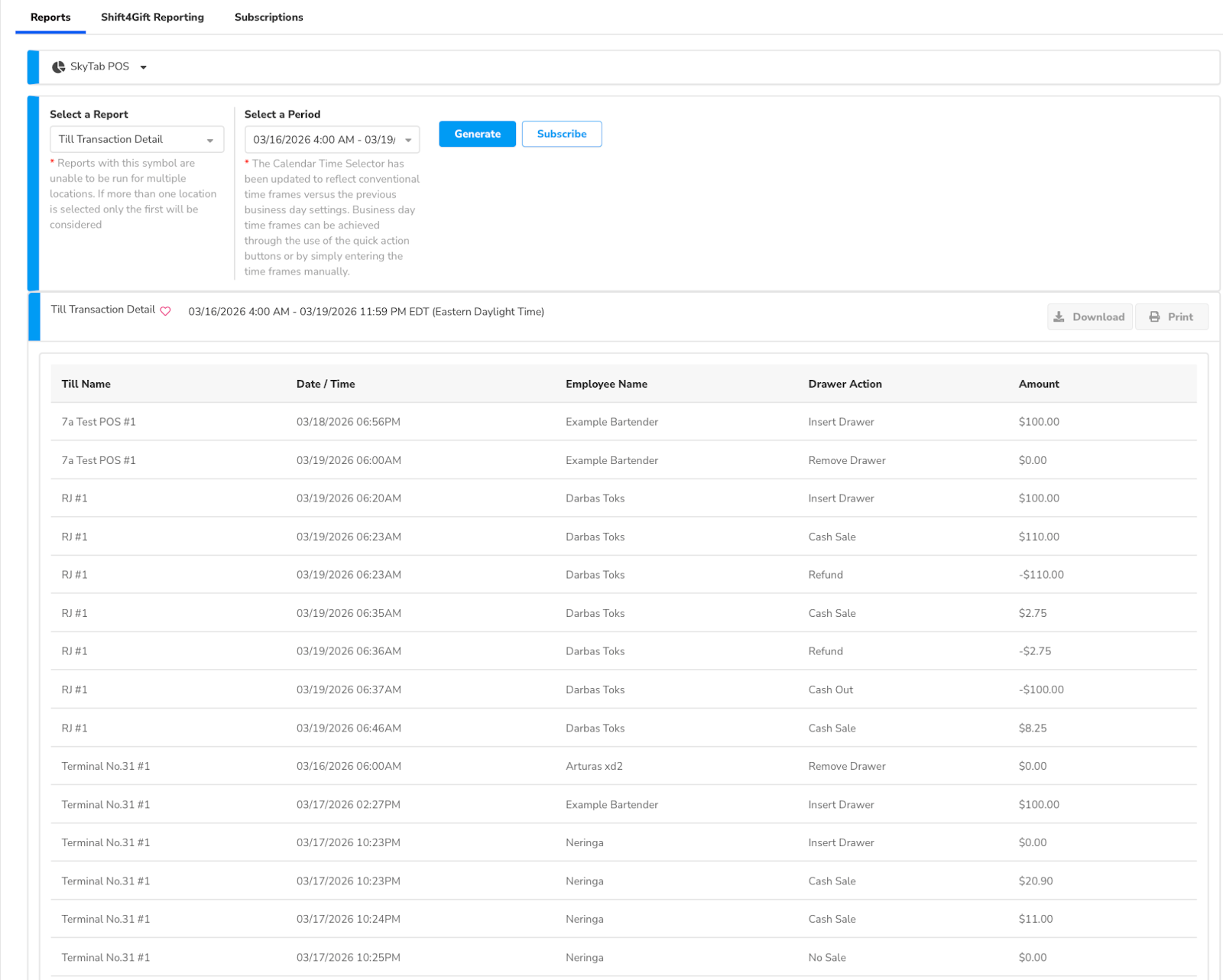 This report shows a chronological log of all register activities, including the till name, date/time, employee name, and the specific amount involved. For auditing purposes, this report helps verify that all Drawer Actions such as inserting/removing drawers, cash sales, refunds, and cash outs are accurately recorded and attributed to individual staff members. It also supports cash reconciliation by providing a transparent line item history of every event that affects the drawer balance, helping to identify discrepancies and ensuring full compliance with operational security standards.