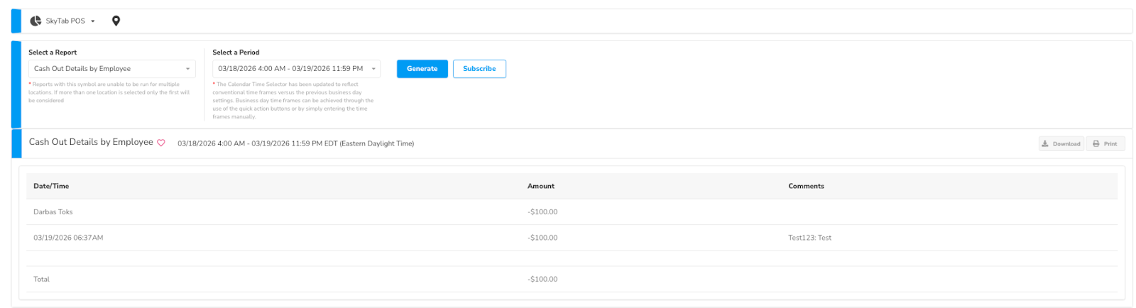 This report shows all cash withdrawals made by employees within a selected time period, including the date/time, employee name and surname, amount, and any entered comments. For auditing purposes, this report helps verify that all cash-outs are properly recorded, trace transactions back to individual employees, and identify unusual activity such as large or frequent withdrawals. It also supports cash reconciliation by comparing reported totals with actual register balances and ensures compliance with cash-handling policies.