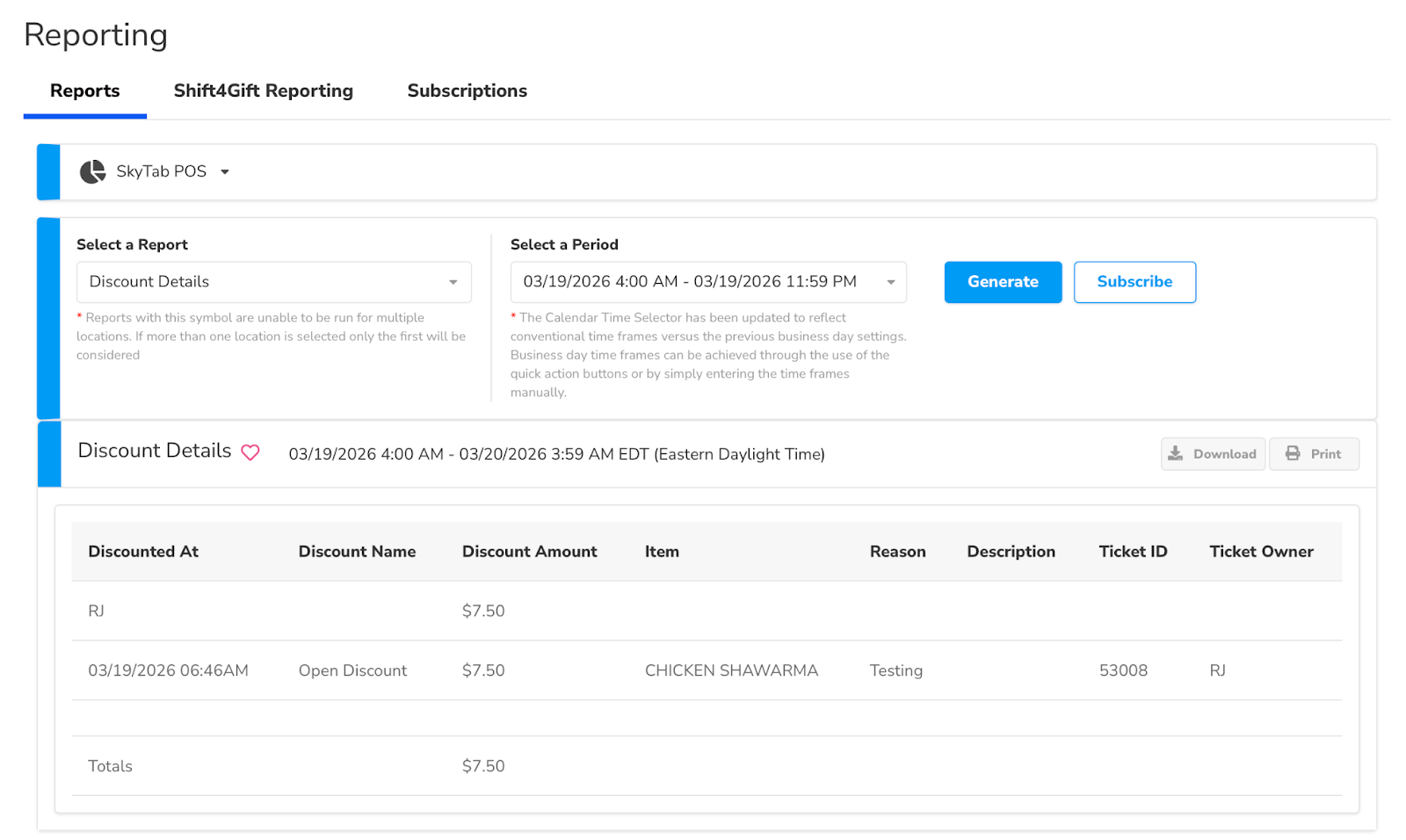 This report shows all discounts applied to transactions, including the date/time, discount name, amount, and the specific item affected. For auditing purposes, this report helps verify that all price reductions are properly justified, trace adjustments back to individual employees through the ticket id and owner, and identify unusual activity such as unauthorized 'Open Discounts' or frequent testing entries. It also supports financial reconciliation by providing a total sum of revenue deductions to be compared against gross sales and ensures compliance with discount-handling policies.