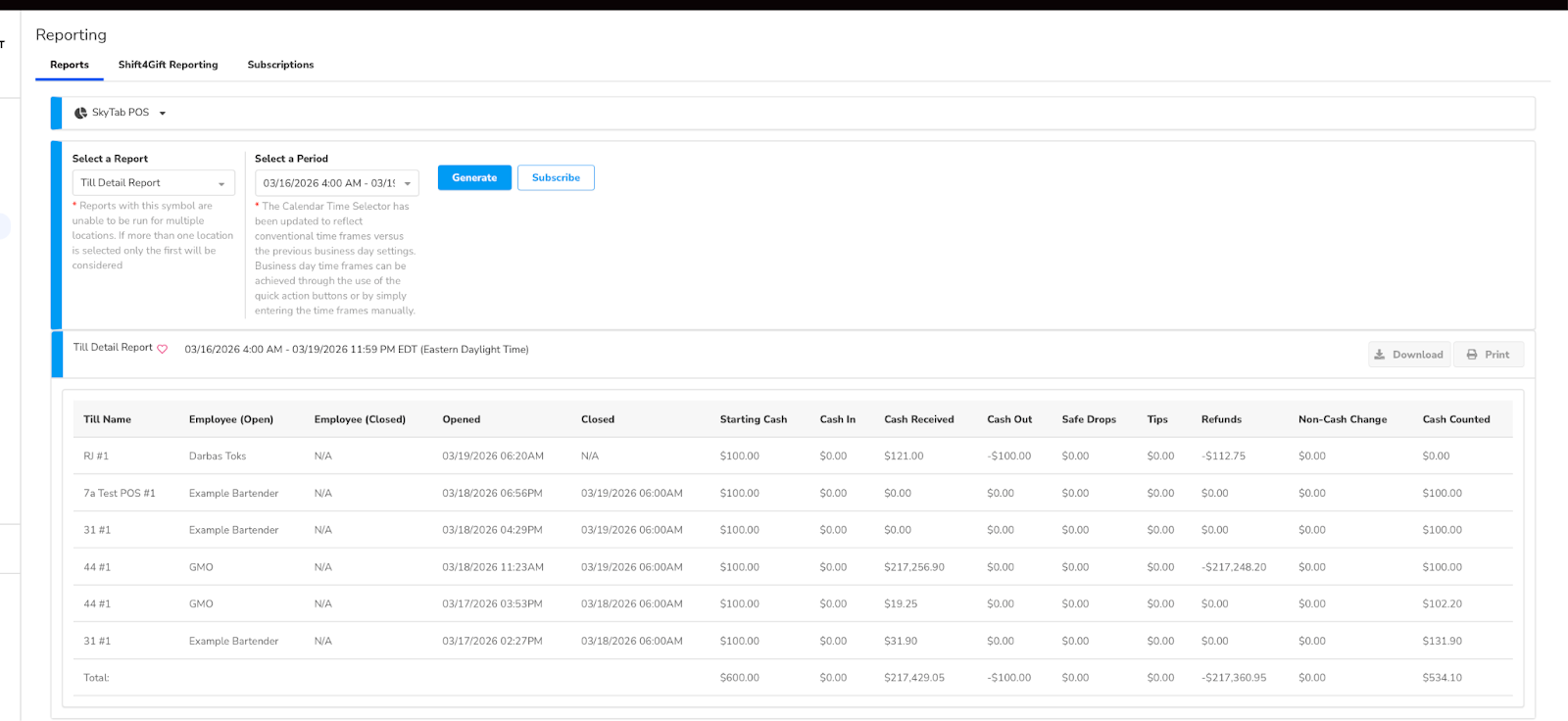 This report shows a comprehensive breakdown of register activity, including the till name, the employees who opened and closed the shift, and the specific opening and closing timestamps. For auditing purposes, this report helps verify the lifecycle of each cash drawer by tracking Starting Cash, Cash In/Out, Safe Drops, and Refunds to ensure every dollar is accounted for. It also supports final cash reconciliation by comparing calculated Cash Received against the actual Cash Counted, allowing management to identify discrepancies, monitor employee accountability, and ensure strict adherence to cash-handling protocols.