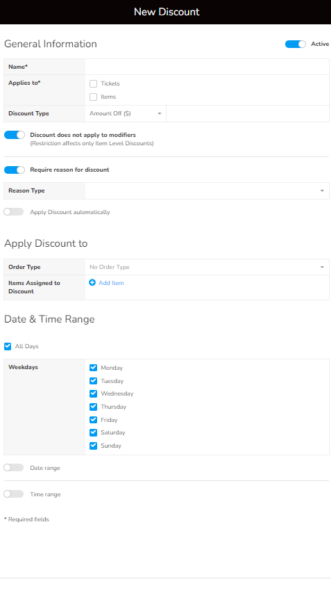 - Require reason for discount: If enabled, allows entering Number or Text reason when applying discount.