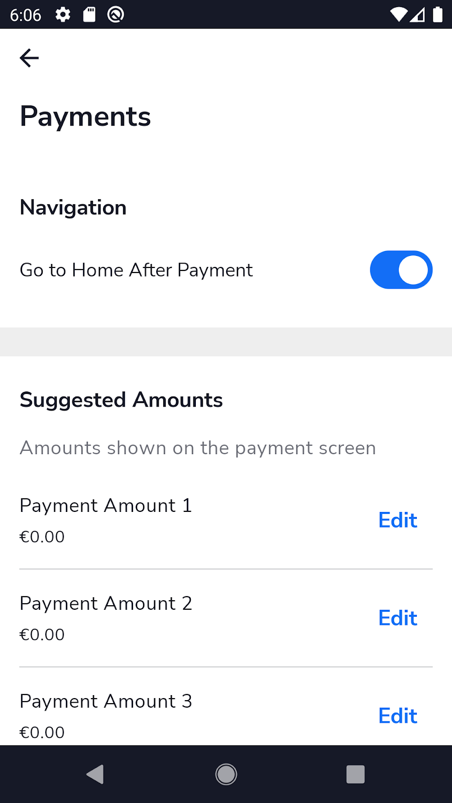 Toggle Go Home Screen After Payment to control whether the device automatically returns to the Home screen after a payment is completed.