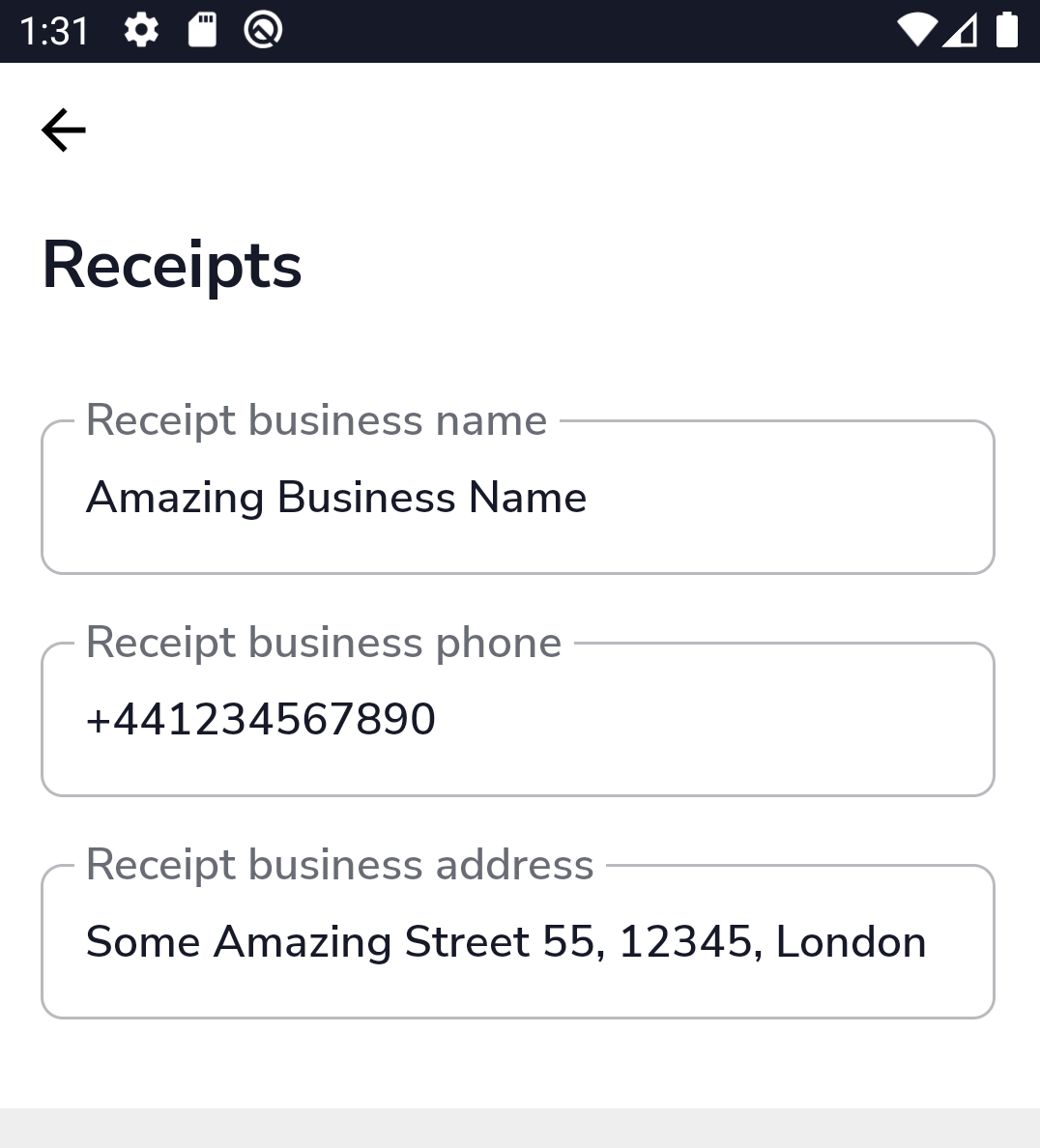 Here, you can set up the business information that will reflect on the receipts.