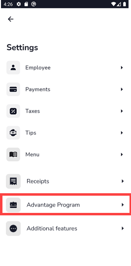 If your business has the Advantage Program, it needs to be set up on the Shift4 One application to be applied to every payment. This can be done from the Settings menu. Make sure to select the correct program and percentage.