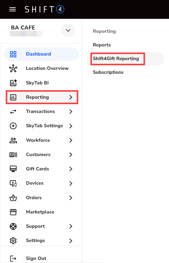 - Go to Reporting on the left navigation and select Shift4Gift Reporting.