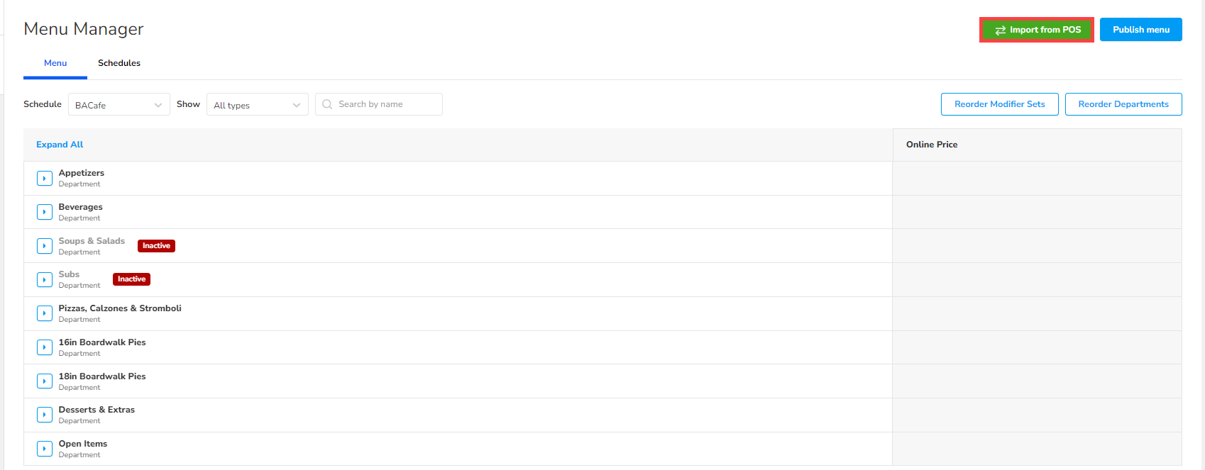 Description: The Import from POS function of Menu Manager allows users to add items to your online ordering site quickly.