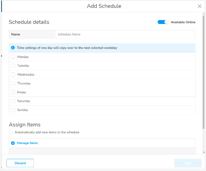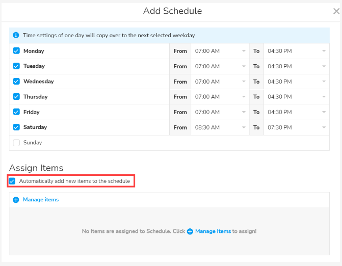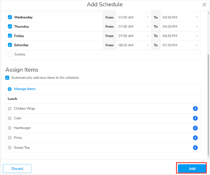 - If desired, place a check in the checkbox for Automatically add new items to the schedule to make sure any new items that are added to the menu are automatically included in the schedule.