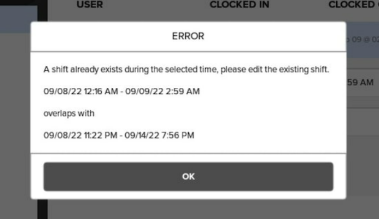 - Concurrent shift validation prevents adding a concurrent shift for an employee. Manually entered shifts by the manager will be validated to prevent the same user from having two concurrent shifts.